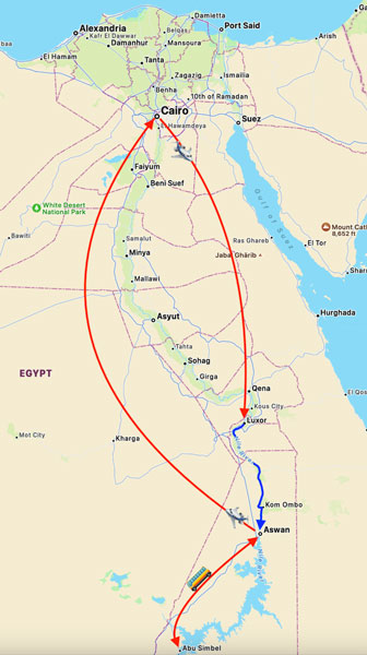 However, the backstory for this trip bears recording here. Events that have continued to reverberate throughout the world to the present day nearly torpedoed the whole trip. It all began during a conversation early in 2010 when John and Carol Gibb told us that they were planning to book a trip to Egypt with Grand Circle Travel (GCT). Rob asked if they might wait a year so that he and I could join them. They agreed and we all signed up for a trip scheduled for autumn of 2011.